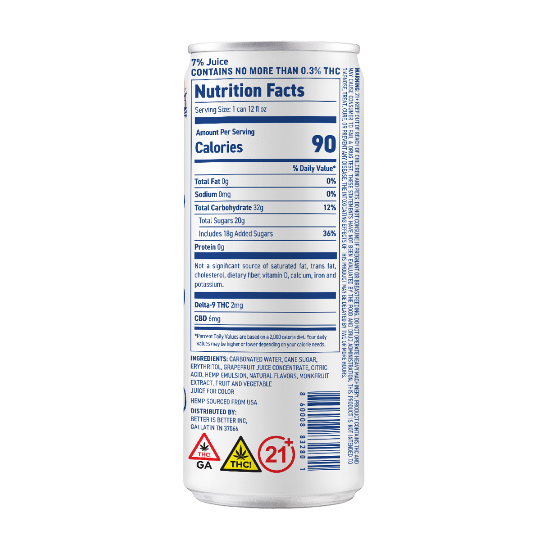 Carbonated water, sugar, erythritol, Grapefruit juice concentrate, citric acid, Hemp emulsion, Natural flavors, monk fruit extract, fruit and vegetable juice for color.
