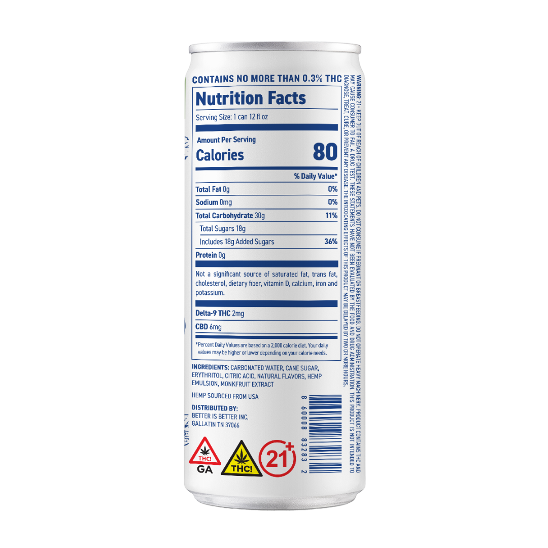 Carbonated water, Sugar, Erythritol, Citric acid, Hemp emulsion, Natural flavors, monk fruit extract